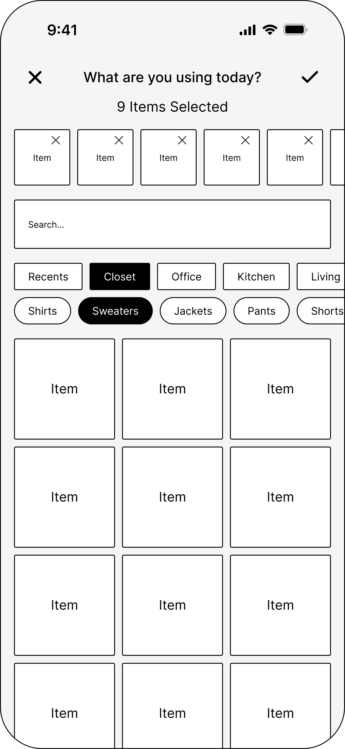 Items frequently used together (makeup, coffee routine, etc.) can be added together with a single tap, acknowledging the difference between routine essentials and daily variables.