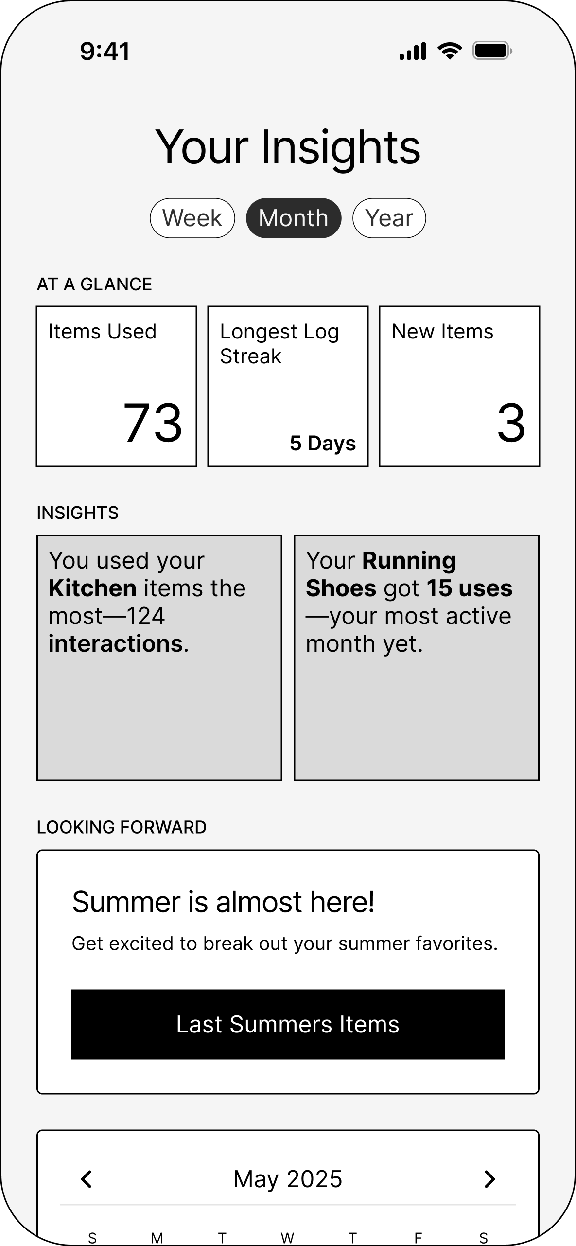 Users track which belongings are actually serving them based on what they’re using, while simultaneously surfacing what isn't—turning daily behavior into visible data that shows them what they really need.